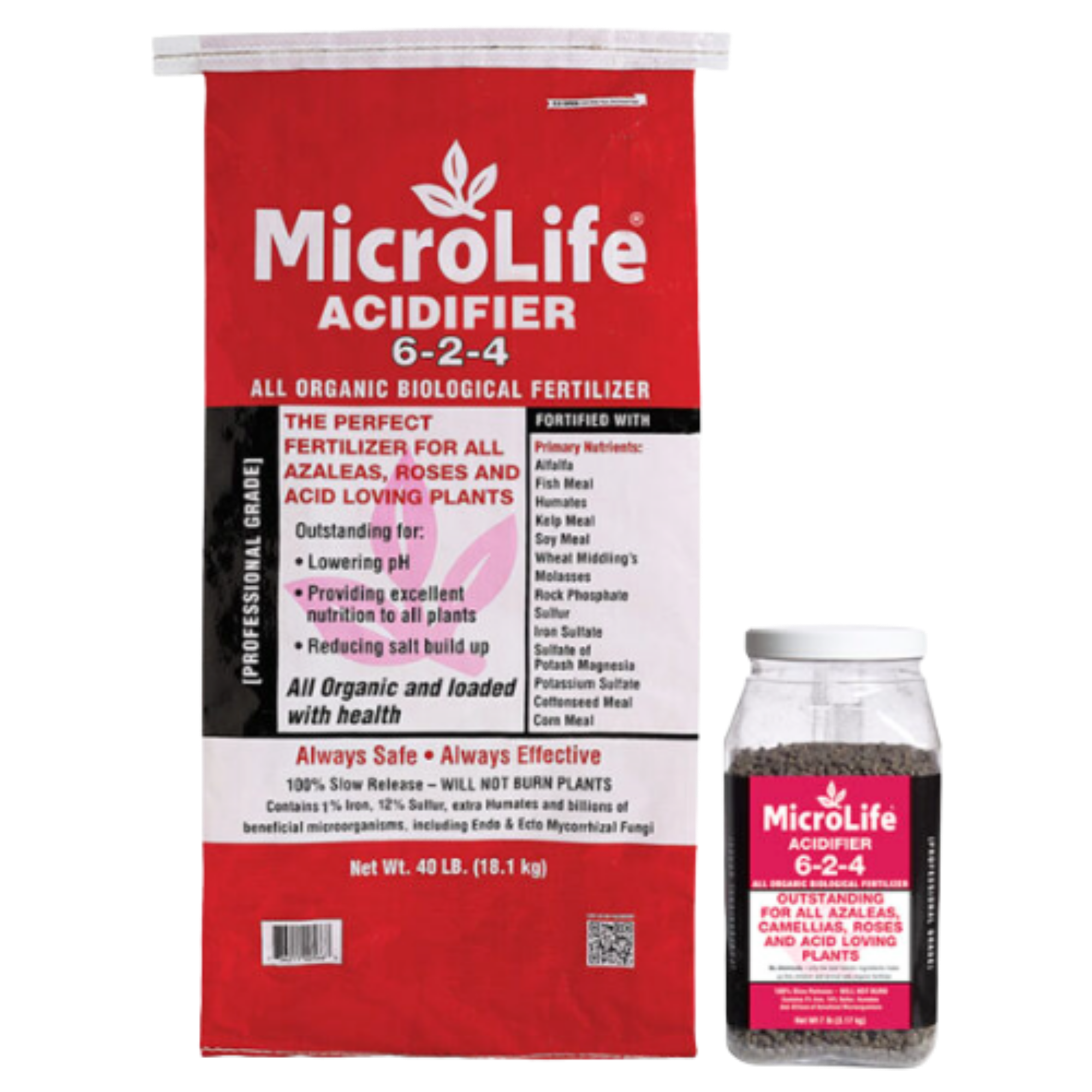 The perfect fertilizer for all azaleas, roses and acid loving plants. Sizes: 40lb Bag, 7lb Jar. MicroLife Acidifier 6-2-4 is outstanding nutrition for all plants that want a low pH environment. Contains extra Sulfur (12%) and Humates to bring out the true health and true beauty of your Azaleas, Roses and Acid Loving Plants.