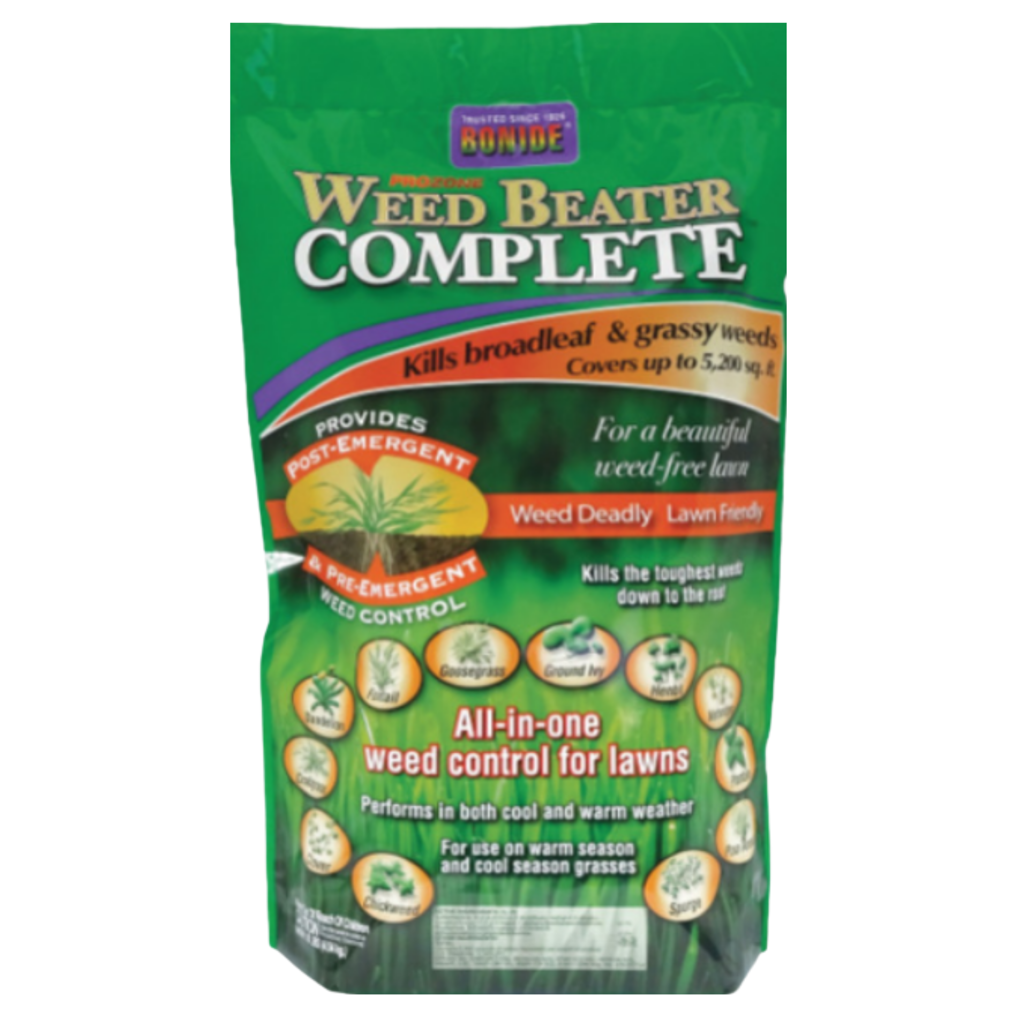 Size: 10lb Bag. Bonide Weed Beater Complete is a powerful pre-emergent and post-emergent granule herbicide that prevents future weeds while killing existing ones in warm-seasoned and cool-seasoned turf.